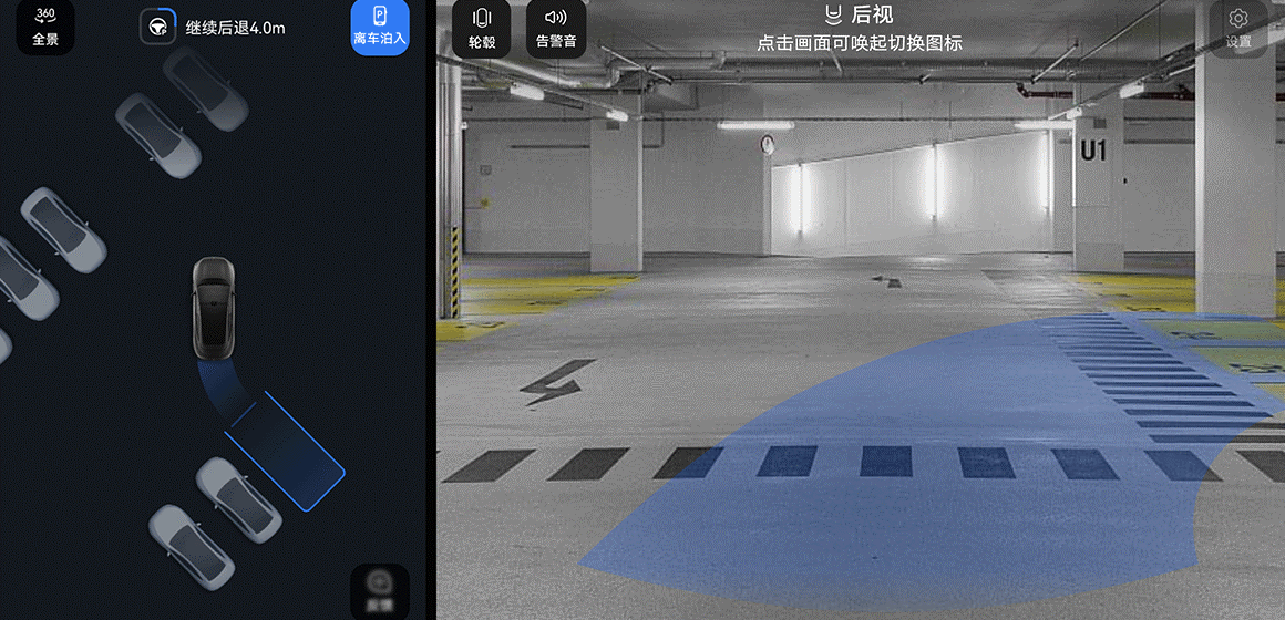 场景四(仅适用于ADS超阶版车型):在暂停循迹倒车时,选择目标车位后,点触“离车泊入”。
