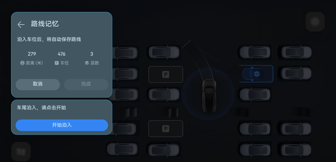 驾驶员也可以驾驶车辆(非ADS辅助驾驶)泊入目标车位,泊入后将车辆切换至P挡,并根据中控屏提示点触“完成”,生成泊车路线,并收藏车位。